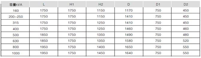注:a.根據用戶要求變壓器的高壓分接范圍可設計為±2×2.5%; b.根據用戶要求變壓器的低壓可設計為0.69KV。