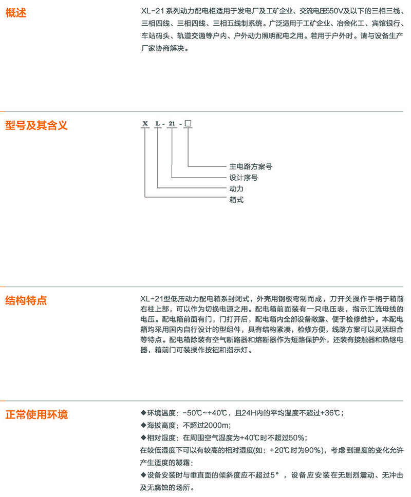 XL-21系列動力配電柜適用于發電廠及工礦企業、交流電壓550V及以下的三相三線、 三相四線、三相四線、三相五線制系統。廣泛適用于工礦企業、冶金化工、賓館銀行、 車站碼頭、軌迫交通等戶內、戶外動力照明配電之用。若用于戶外時。請與設備生產 廠家協商解決。