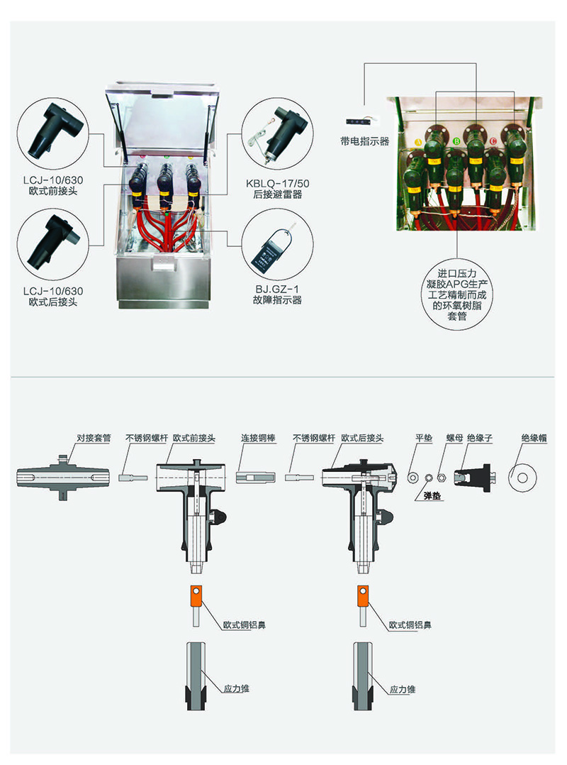 歐式電纜分接箱是近年來廣泛用于電力配網系統中的電纜化工程設備,它的主要特點 是雙向開門、利用穿墻套管作為連接母排,具有長度小、電纜排列浦楚、三芯電纜不 窩要大跨度交叉等顯若優點。其所采用的電纜接頭符合DIN47636標準。一般采用額 定電流630A螺栓固定連接式電纜接頭。